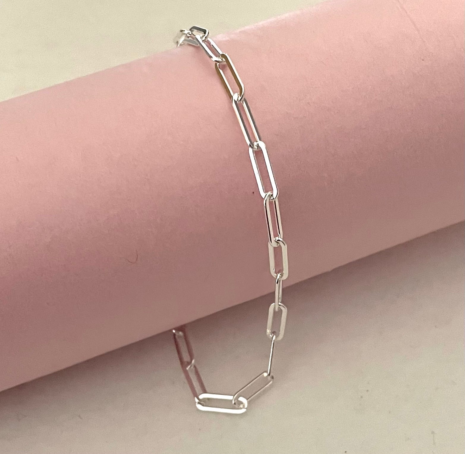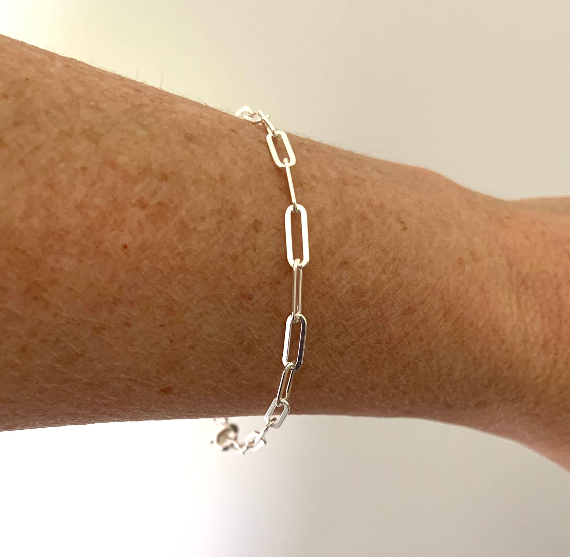 Paperclip bracelet with shiny flat links in a daintier but just right size of 3.5 mm width links. It's a fabulous bracelet for everyday wear, great for stacking with another bracelet, and great for gifting! Length is 7.5 inches. The great thing is, the length is adjustable, just clasp into the link you prefer! Secures with a sturdy lobster clasp. Matching necklace available. Solid 925 sterling silver from Italy.