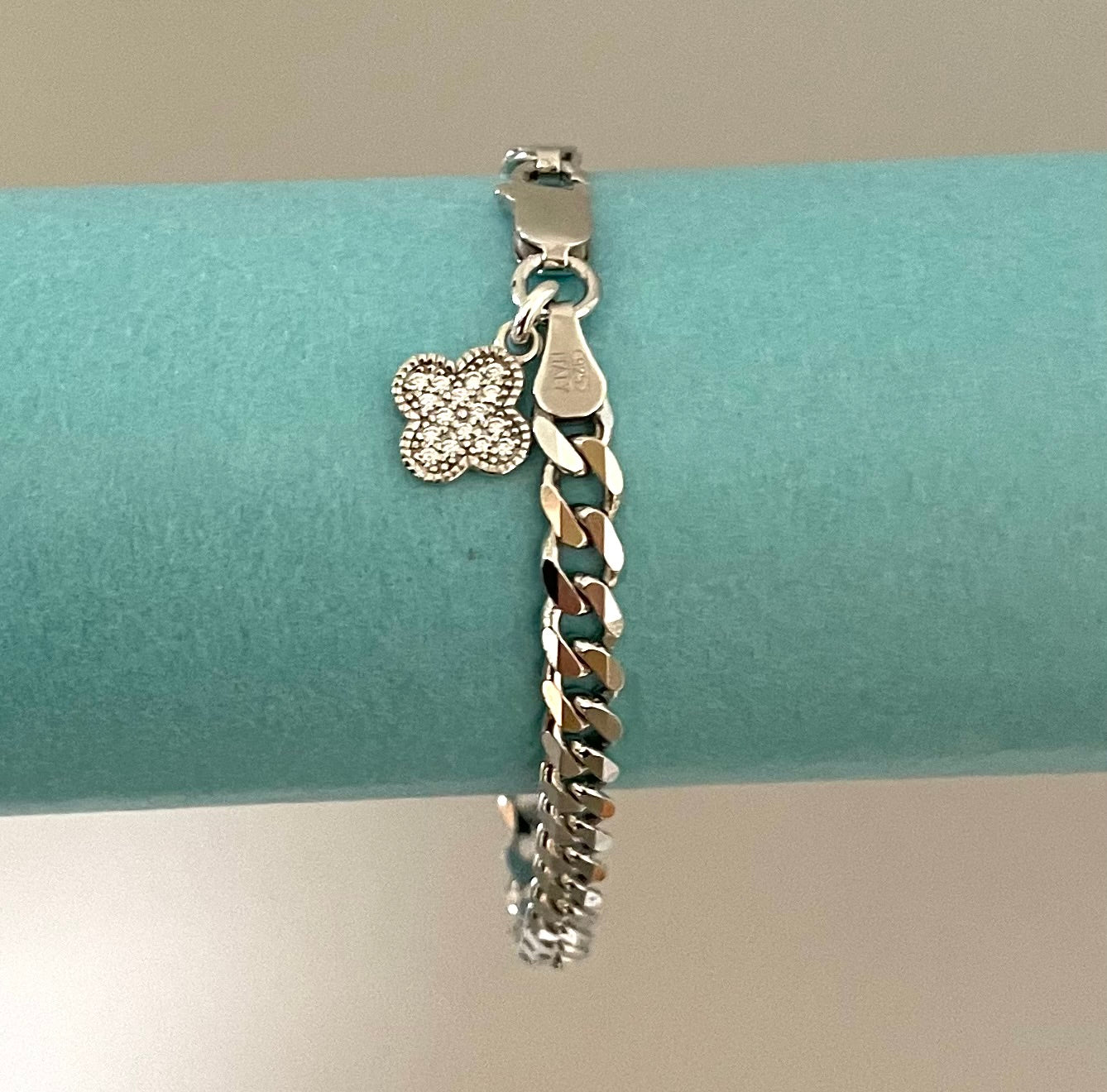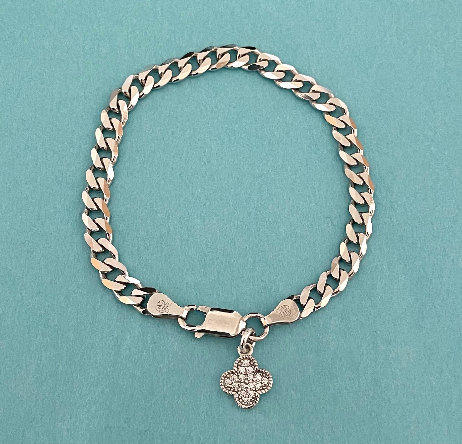 Super stylish and simply stunning! This bold link clover bracelet is perfect for everyday wear, it's nice and strong, you don't have to worry about it. Features a sweet clover dangle charm with sparkly cubic zirconias. The links are thick and very substantial at 6mm in width. Very shiny and reflective, it really makes a statement! A fabulous premium lifetime bracelet with nice weight to add to your jewellery collection! Secures with a large strong lobster clasp. 7.25 inches in length. Solid 925 sterling silver from Italy.