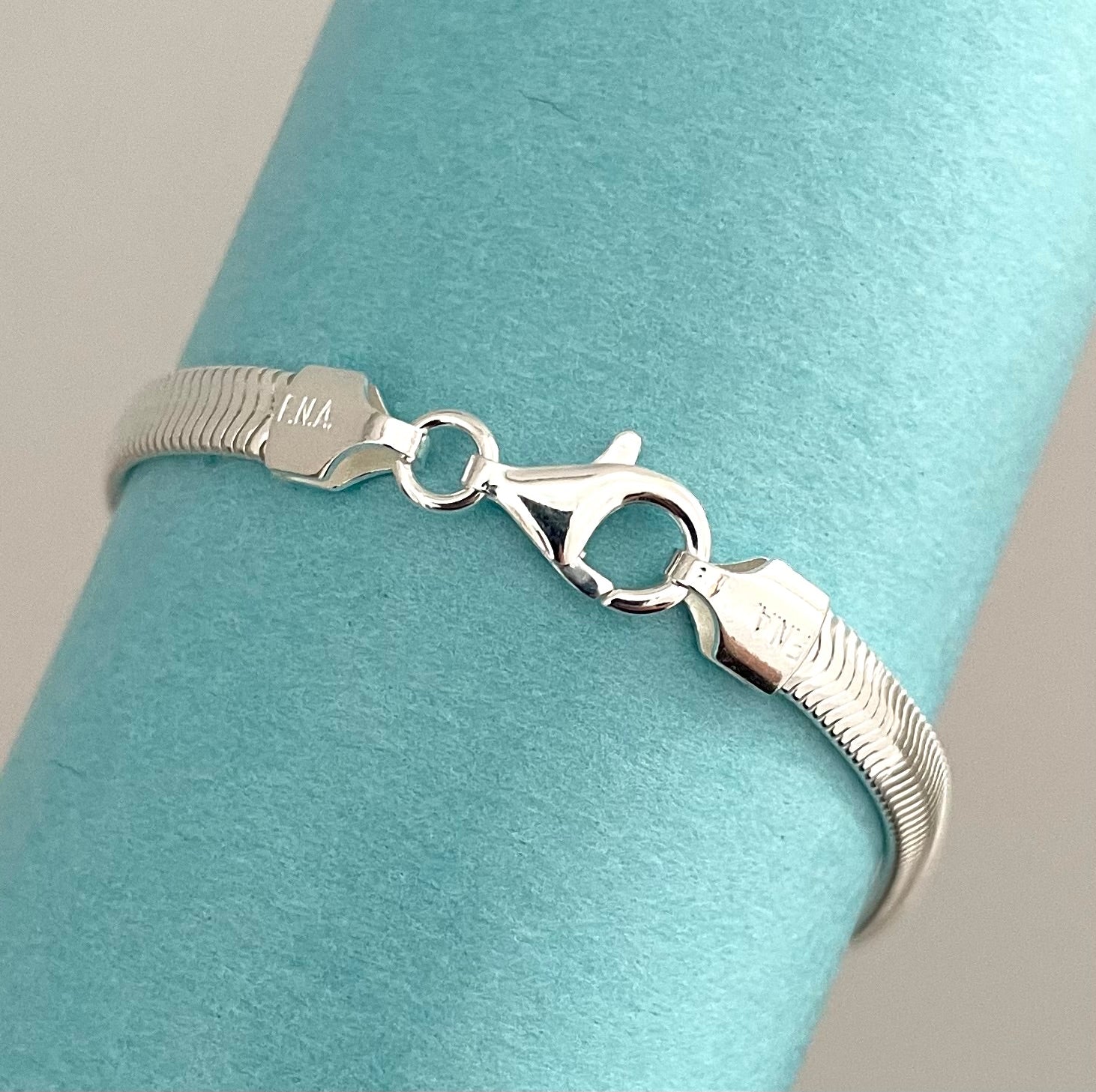 Incredibly shiny and reflective, this stunning snake bracelet will add some glam to your look! Features the oval snake link with 6 sides diamond cut in a substantial 4mm width. Feels silky smooth on and is very comfortable. Length is 7 inches. Secures with a large strong lobster clasp. Solid 925 sterling silver from Italy.
