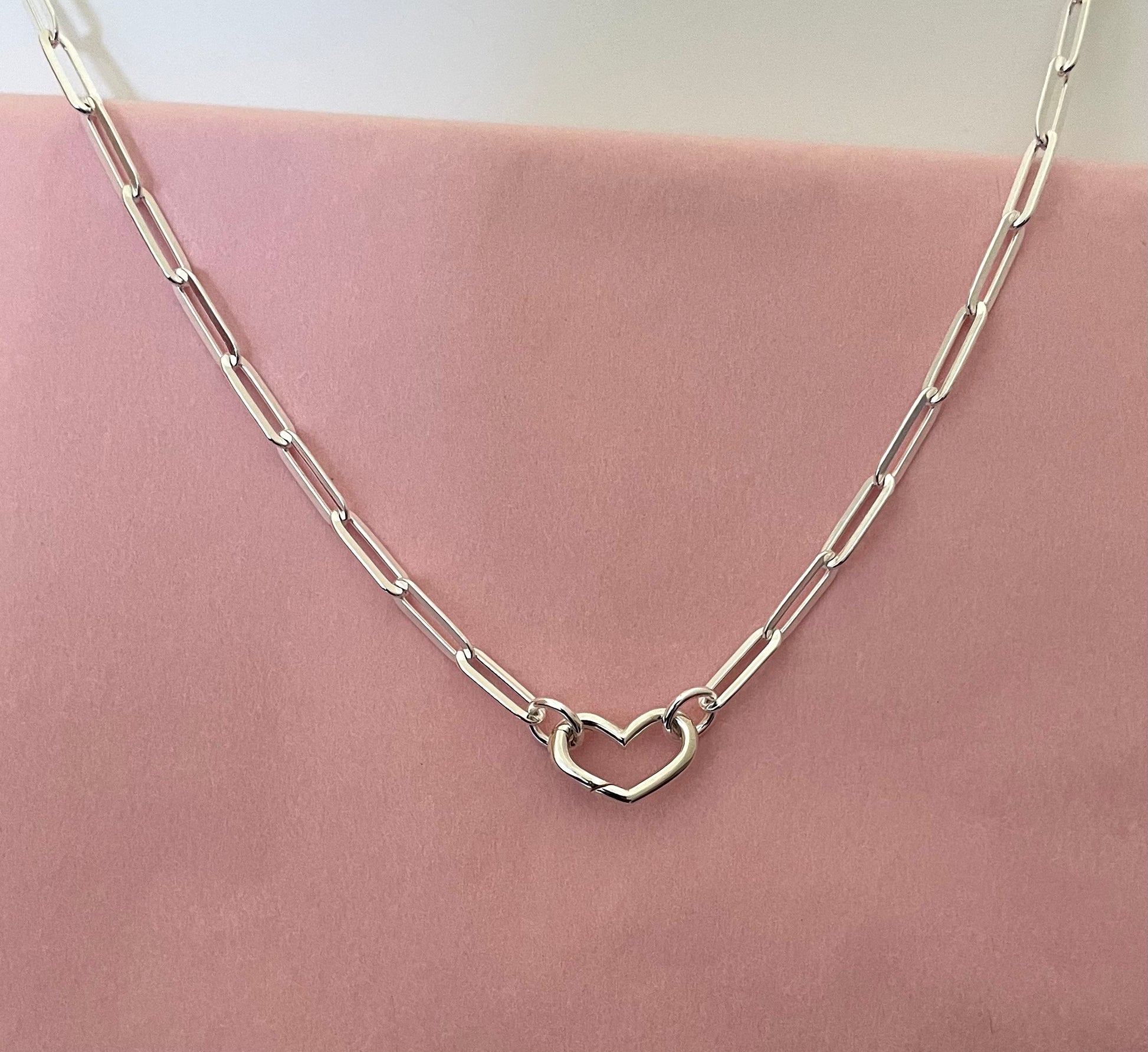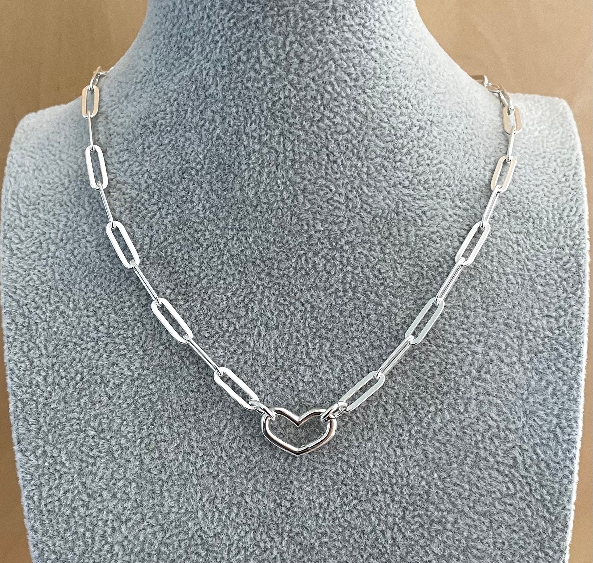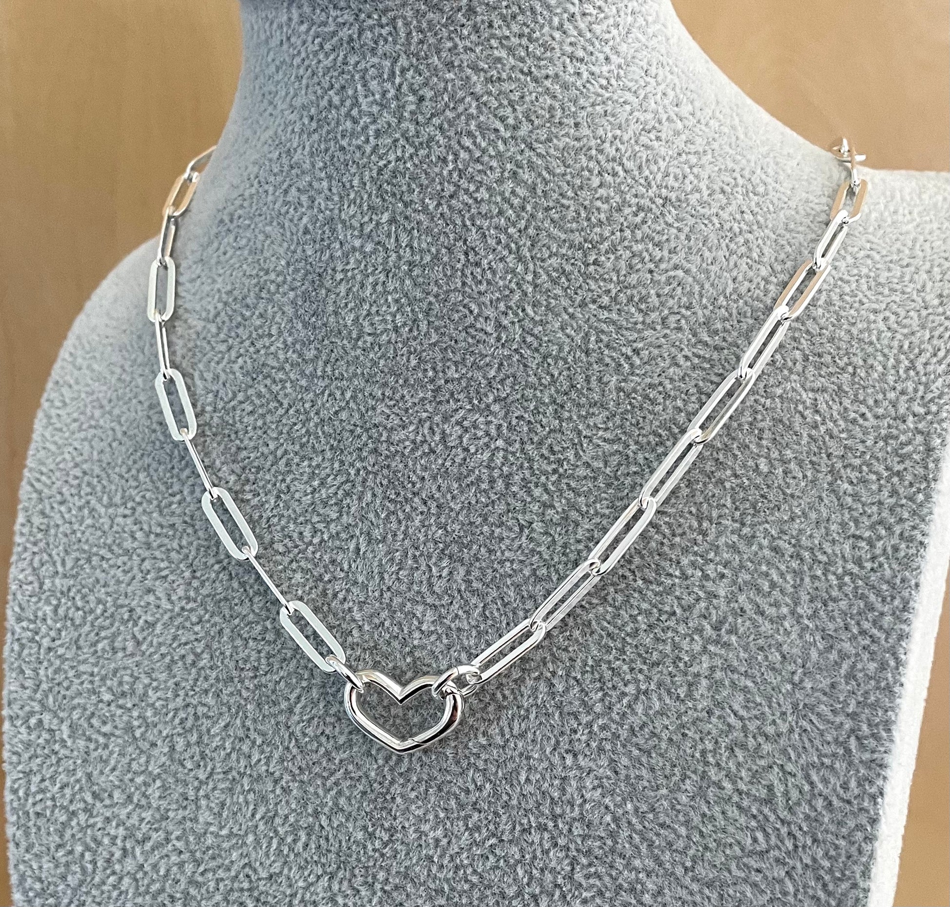 Show your love with this premium paperclip charm holder necklace. Thick shiny flat links in 4mm width. Very reflective, it catches the light and has that 'wow' sparkle! Features a hinged heart shaped charm holder, it opens and closes to switch out your charms. 18 inches in length and is adjustable, just clasp into the link you prefer to wear it shorter. Secures with a nice sturdy lobster clasp. All in solid 925 sterling silver from Italy. (Compare at $399)