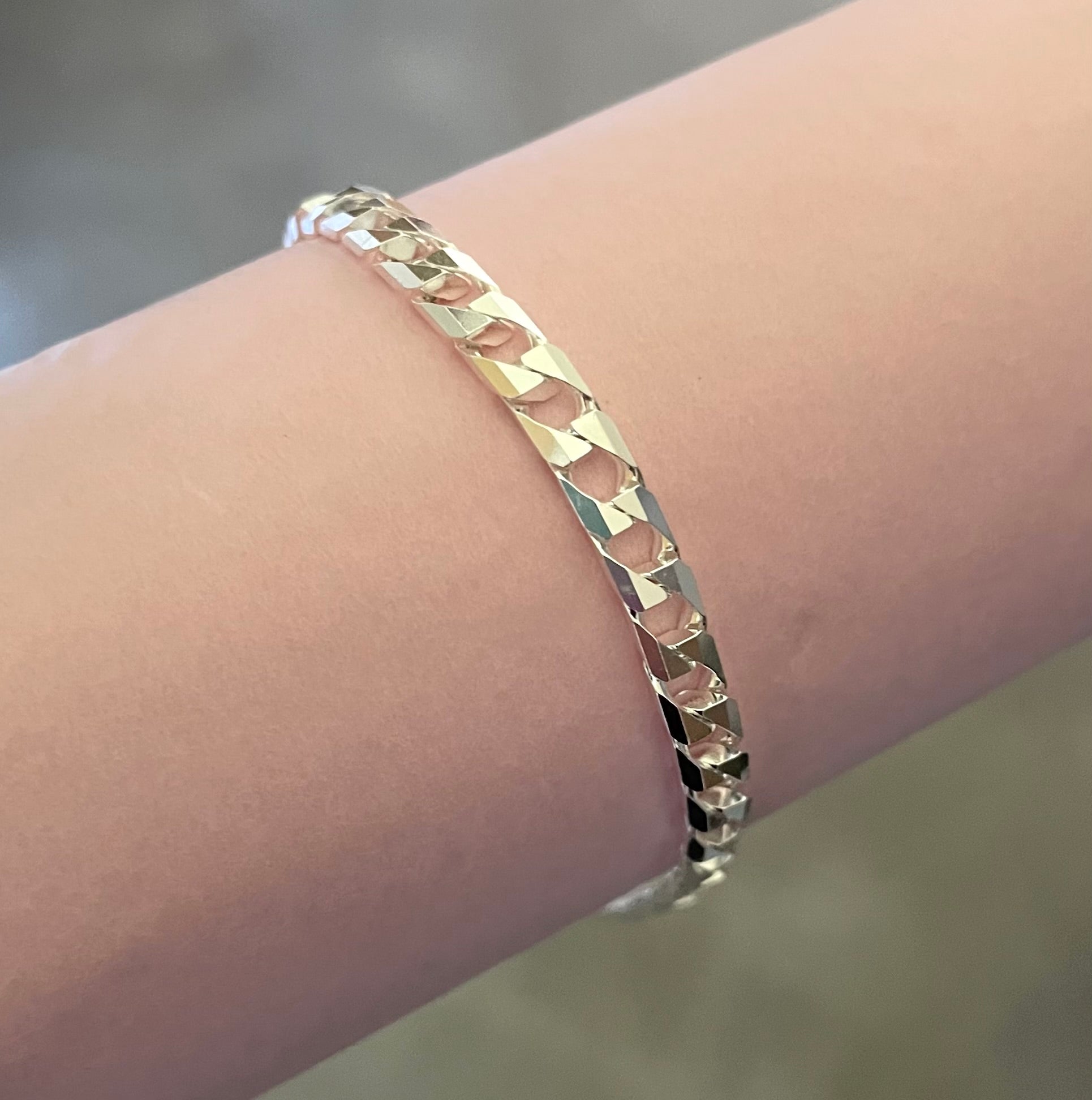 You'll be a star wearing this stunning bracelet! The square links are almost retro and very reflective, it catches the light nicely and shines. Links are substantial at 4.5mm in width. Length is 7 inches. Secures with a large strong lobster clasp. Solid 925 sterling silver from Italy.