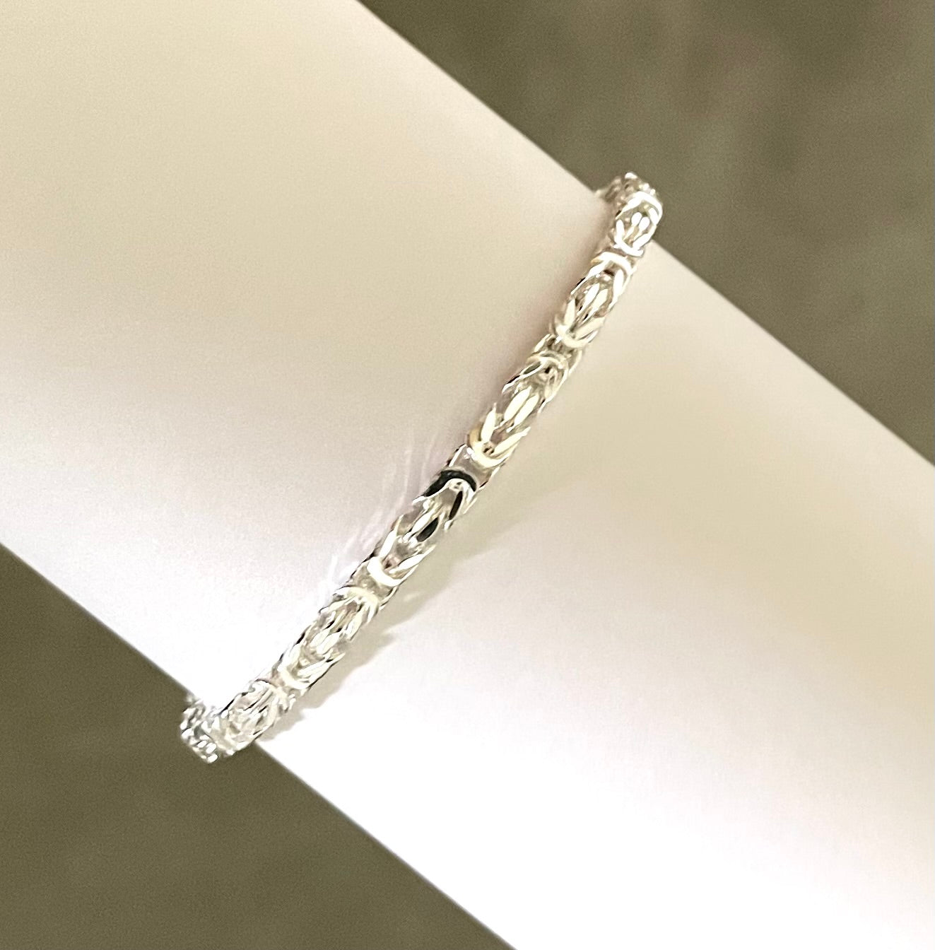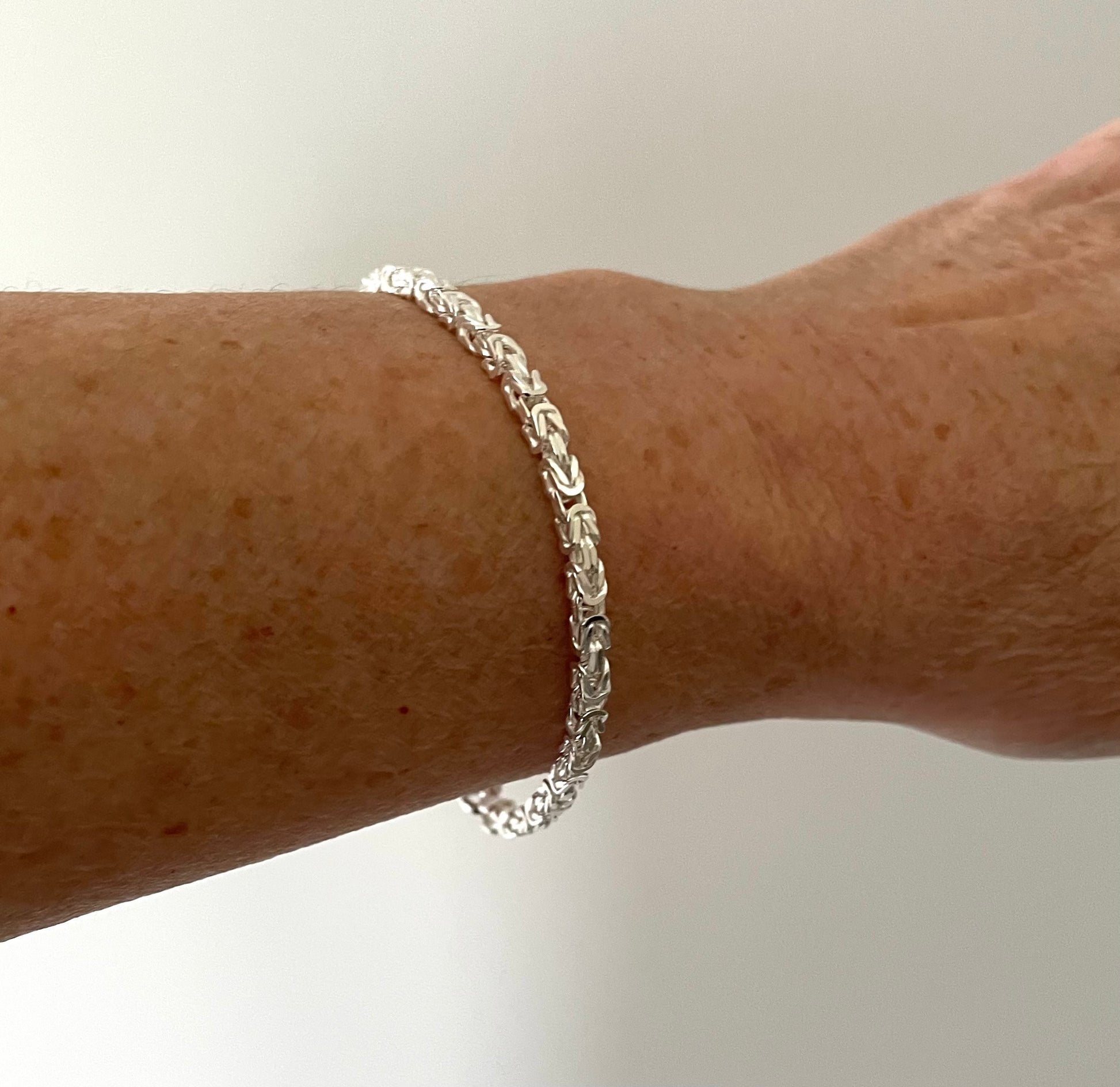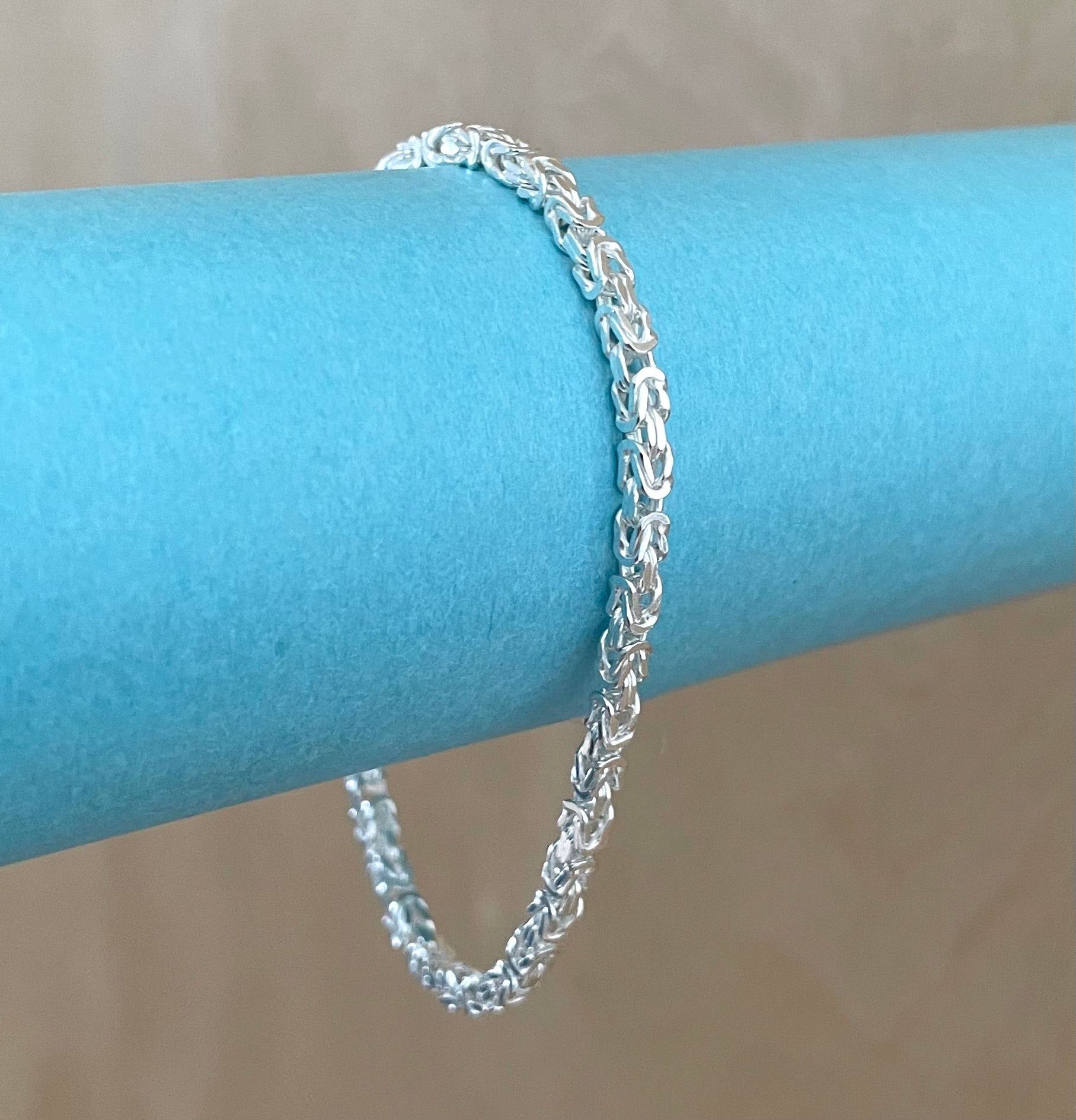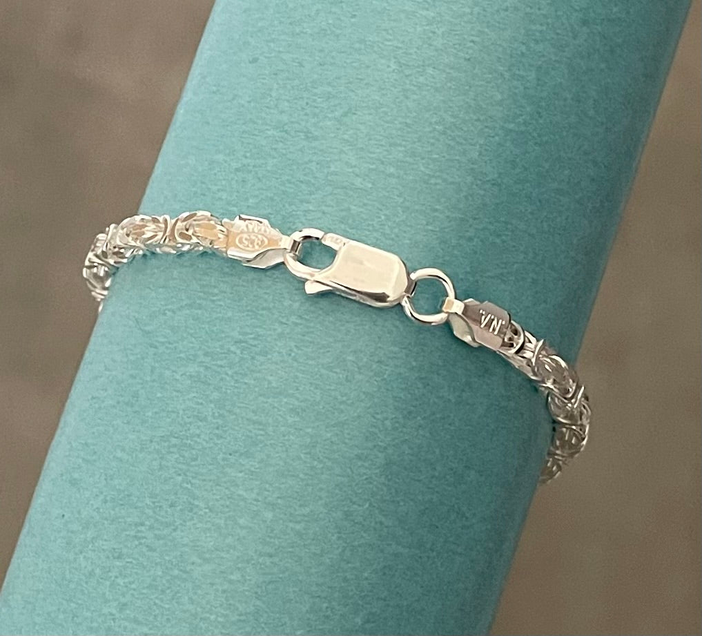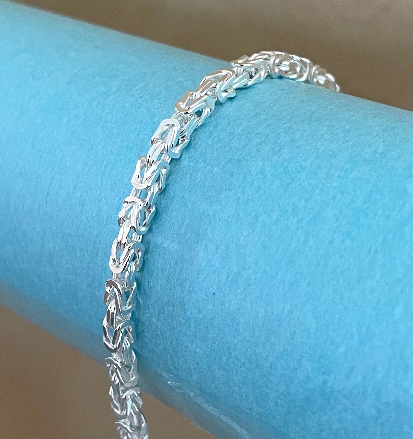 Beautiful and timeless! This Byzantine link bracelet is 4 sided, showing these exquisitely crafted links on all 4 sides! Links are substantial at 3.5mm but not over the top. It's that 'just right' bracelet, it shows up well as it's very shiny and sparkly! Has a large sturdy lobster clasp. Length is 7 inches. Solid 925 sterling silver from Italy.