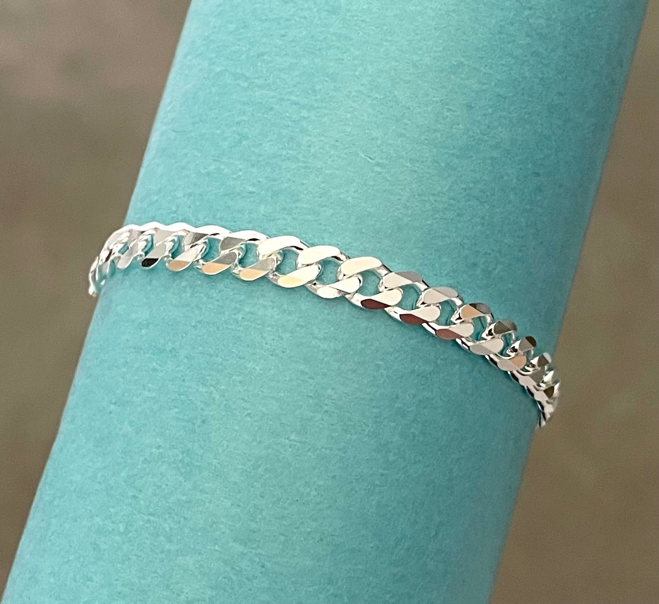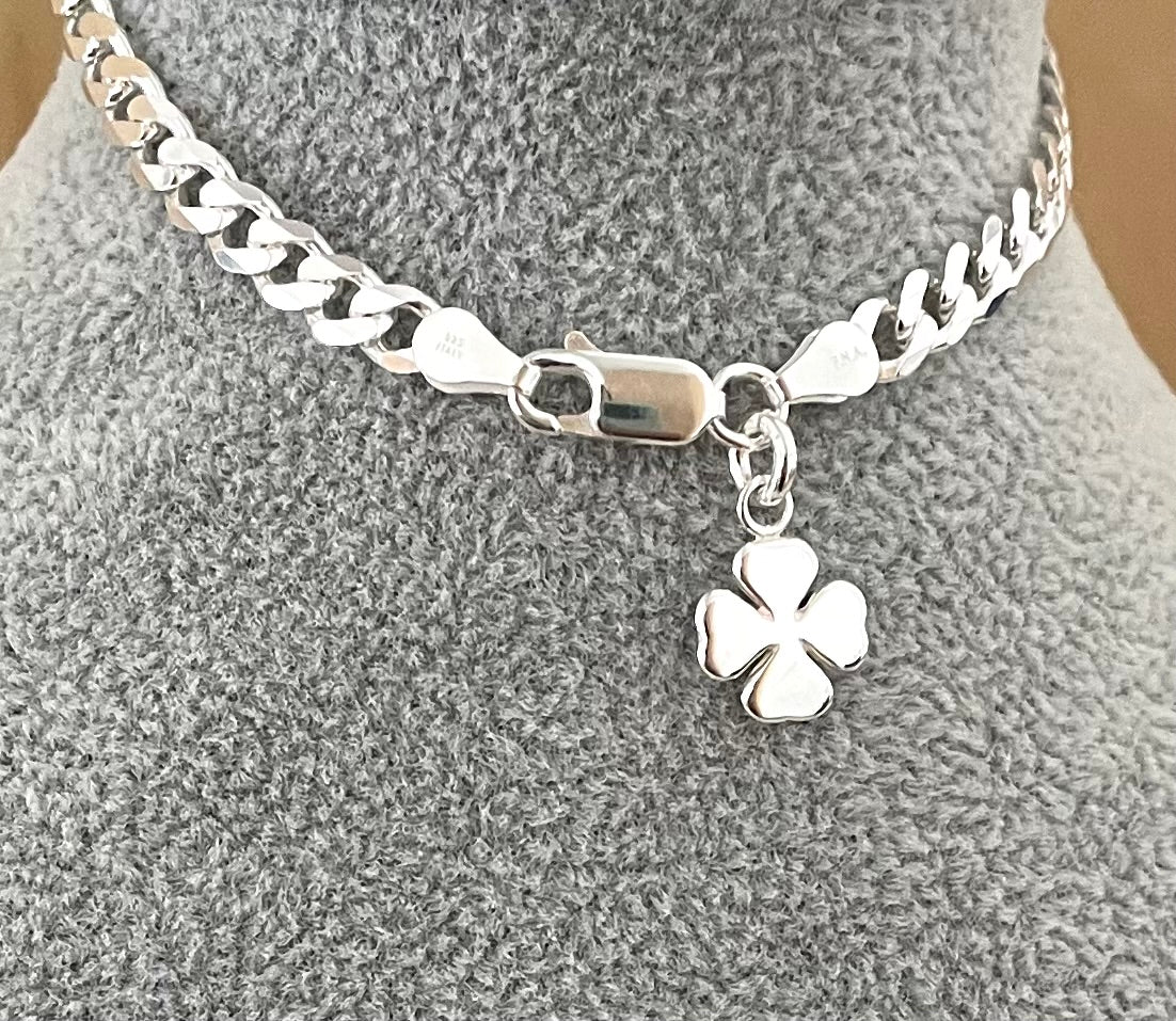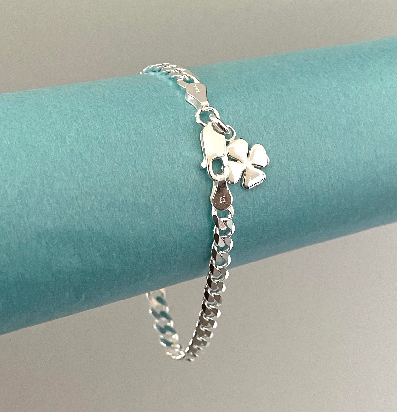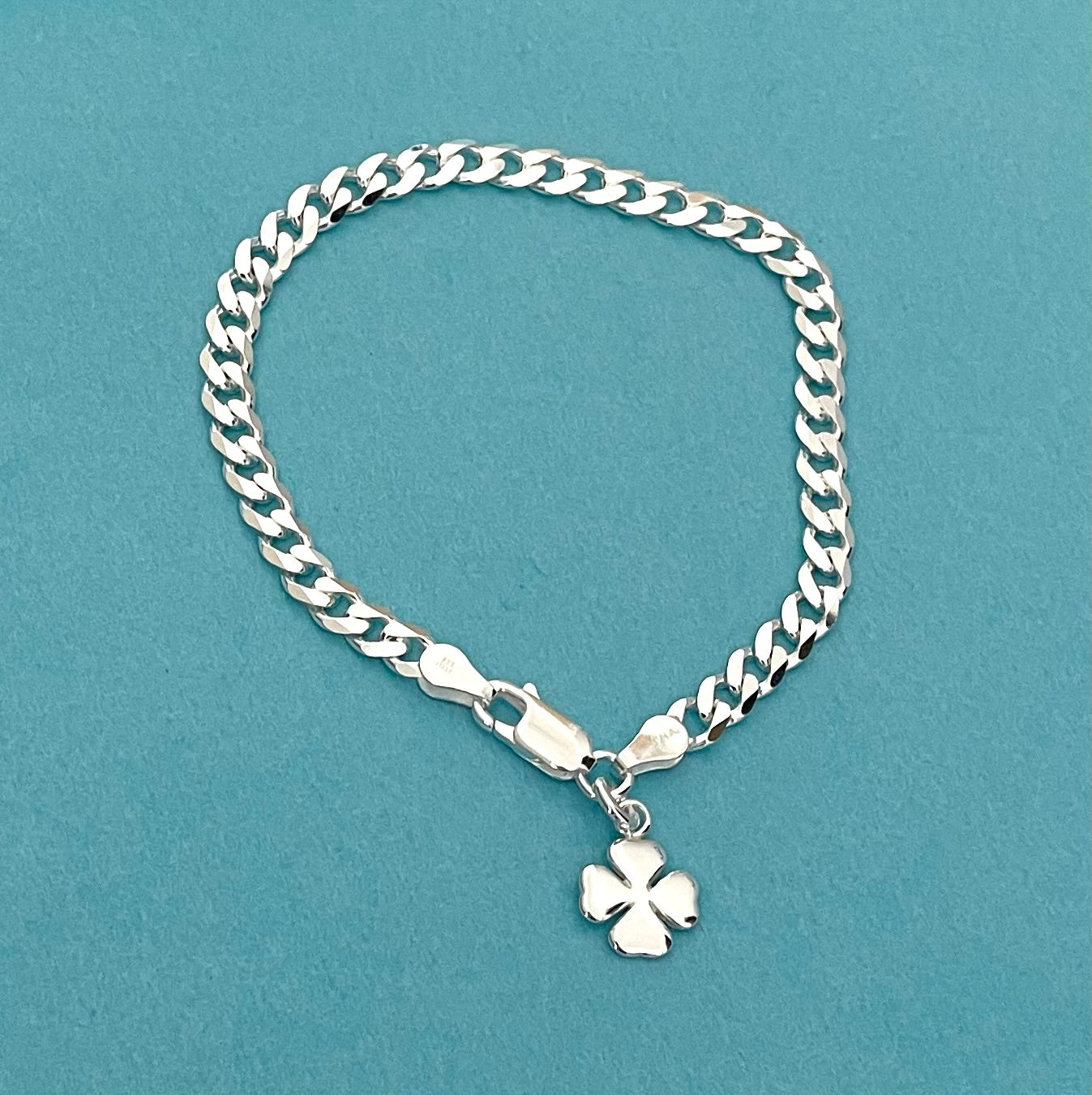 Catch a lucky break with this beautiful four leaf clover bracelet! Timeless and classic, just perfect for everyday wear! Links are the thick and shiny curb links in a substantial width of 4.5mm. It shows up well on your wrist! Secures with a large sturdy lobster clasp. Available in 7 inch and 7.5 inch length. Solid 925 sterling silver from Italy.