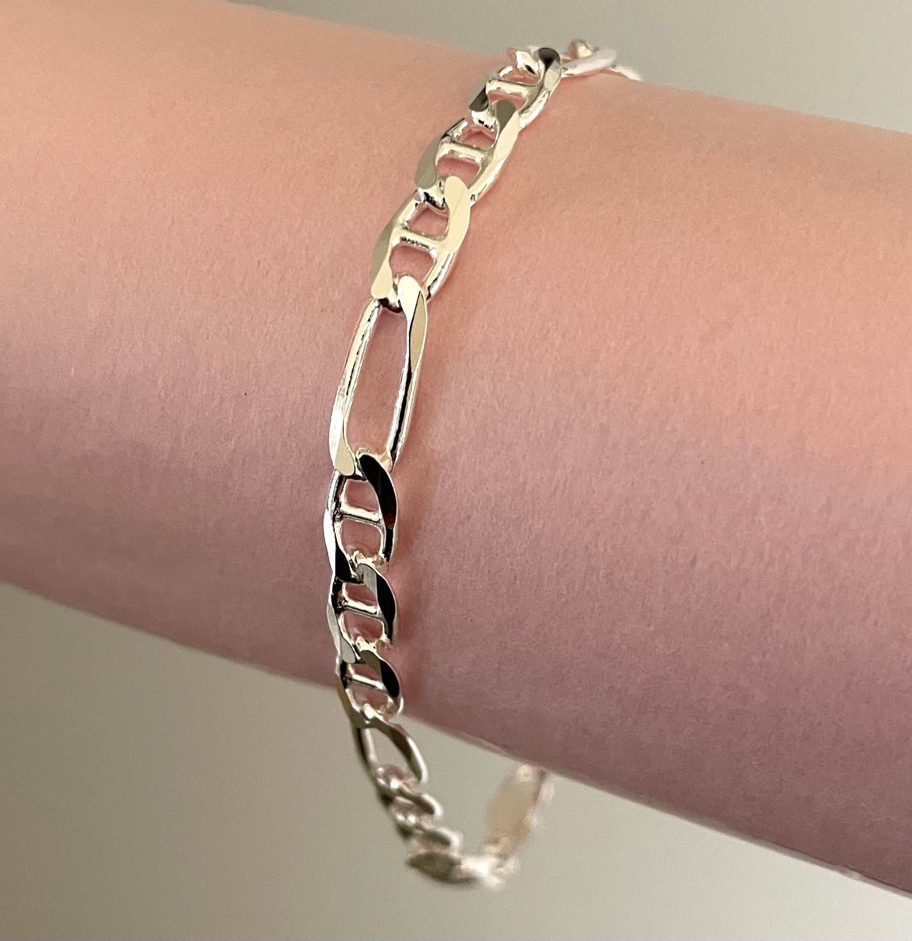 This bracelet features the famous and popular Figaro link, the link that's loved world wide! It's beautiful and timeless, it looks classically fabulous on. The links are substantial at 4.9mm in width (not too wide, just right). Great to wear on it's own, and perfect for stacking with other bracelets. Length is 7 inches. Secures with a nice sturdy lobster clasp. Solid 925 sterling silver from Italy.
