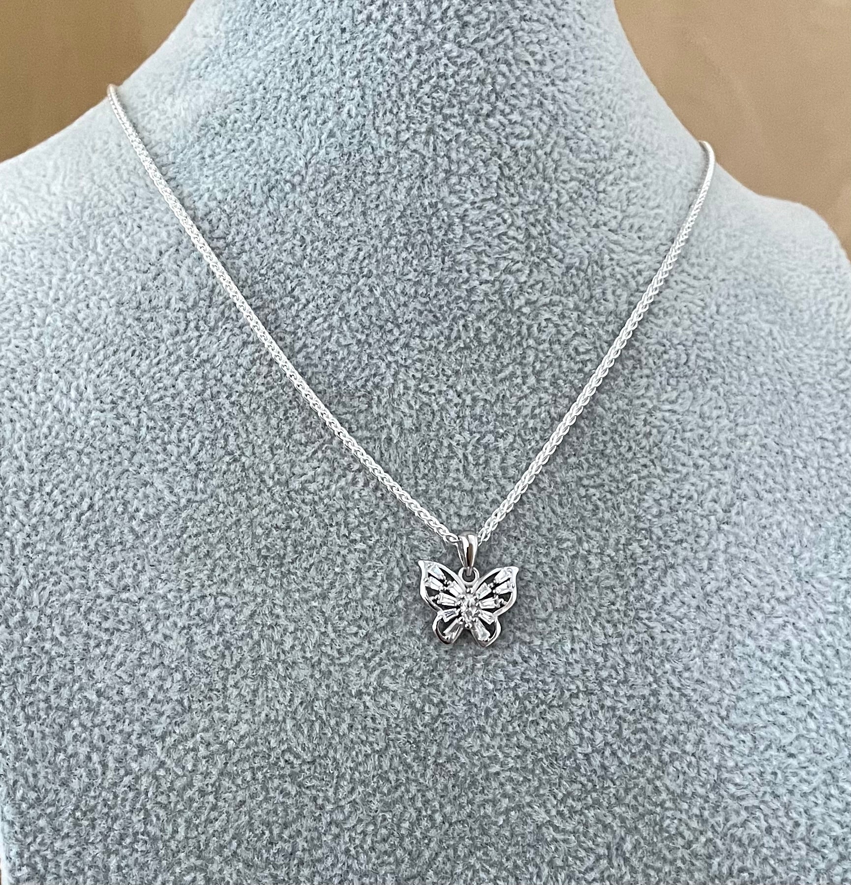 This sparkly butterfly necklace will attract attention! Features a beautiful butterfly pendant filled with cubic zirconias that catch the light and sparkle. Sits on a lovely silky smooth Spiga chain in 1.5mm width. Length is 18 inches. Secures with a nice sturdy lobster clasp. Pendant is 1/2 inch in size. Solid 925 sterling silver from Italy.
