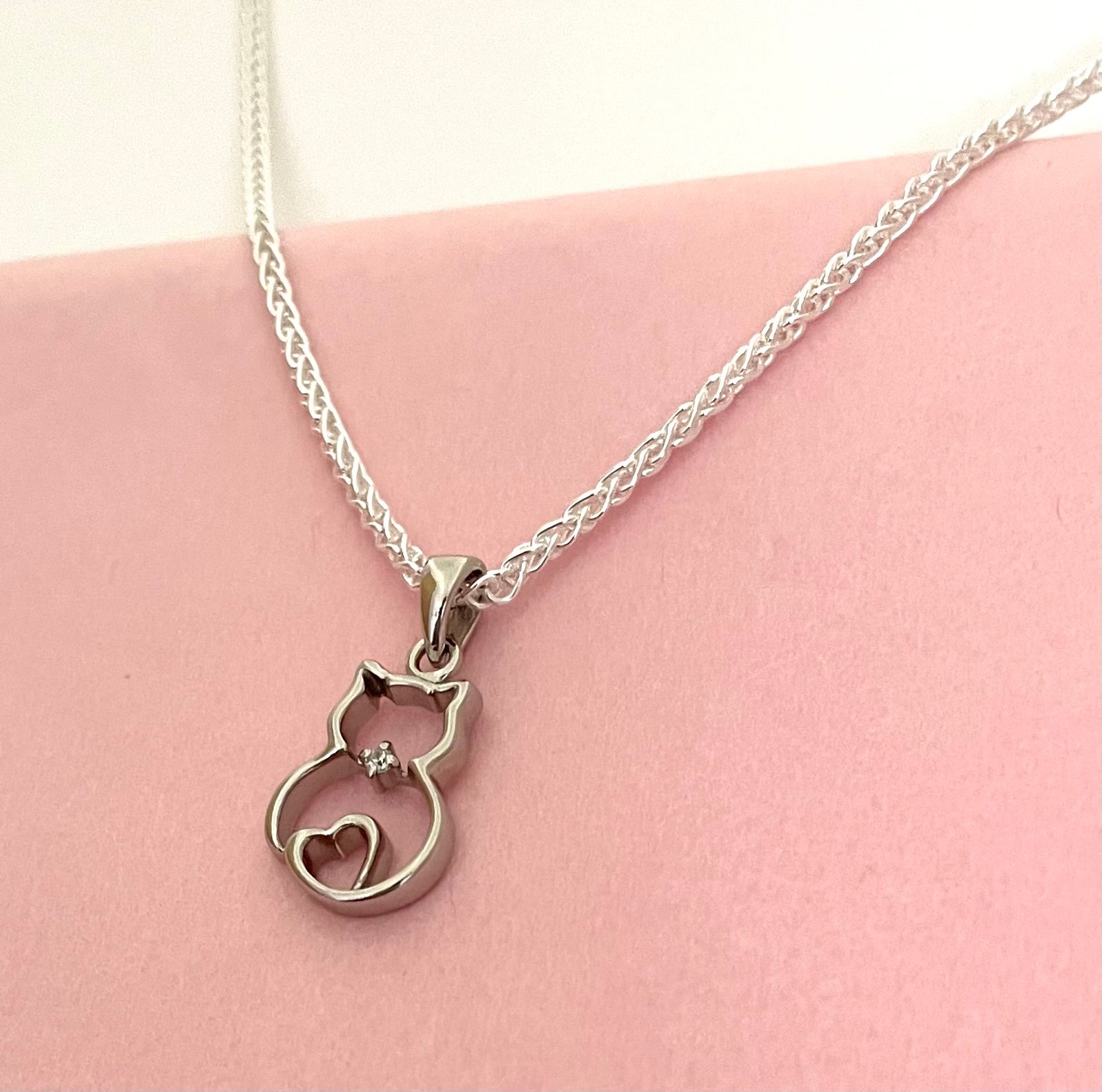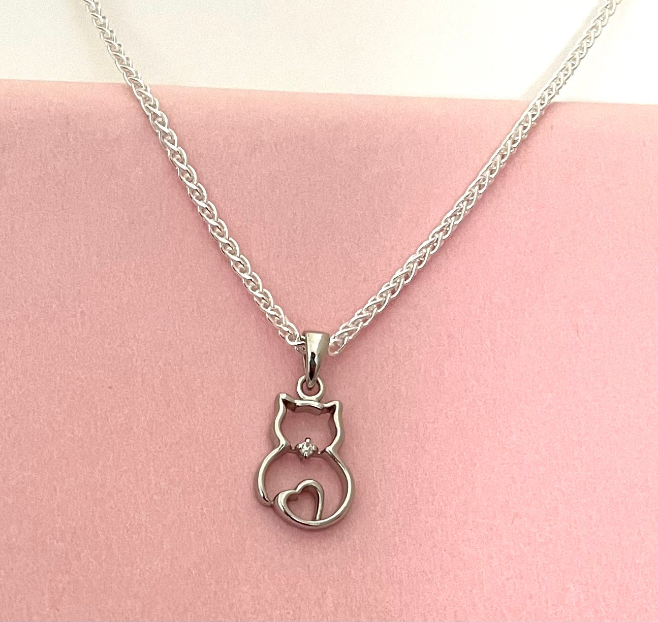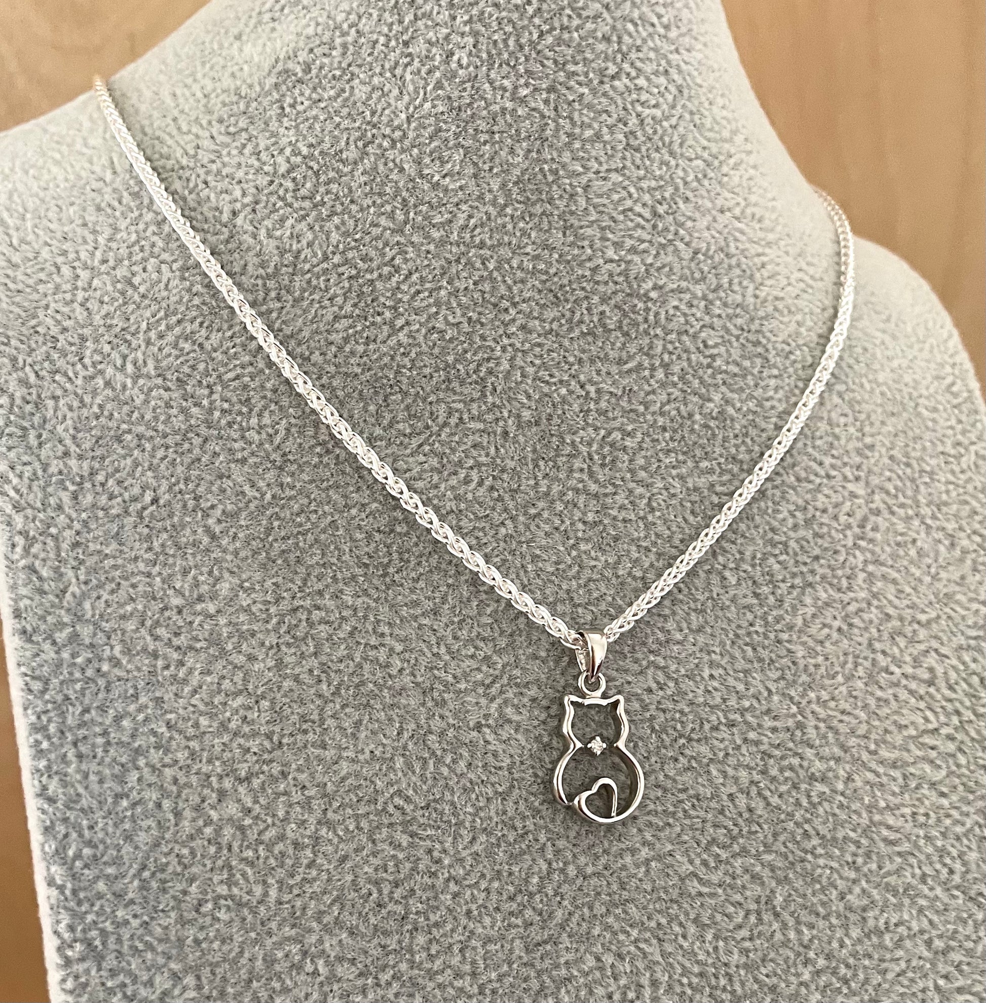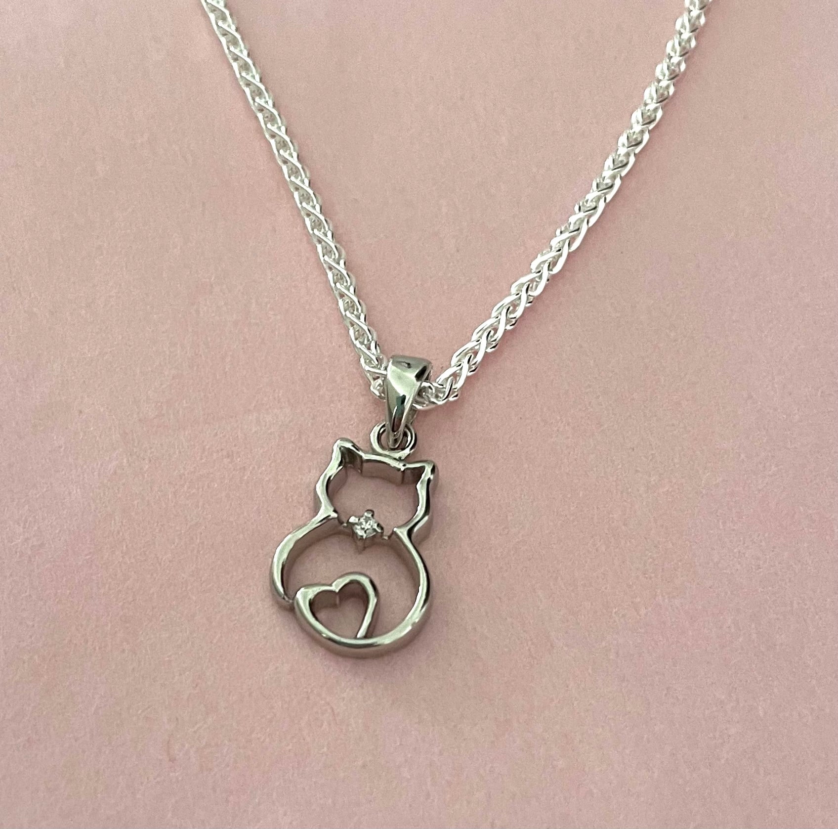 This sweet cat necklace will be cherished in your jewellery collection! The lovely cat pendant sits on a Spiga chain. The pendant features a heart and a sparkly cubic zirconia stone, and is well made (not flimsy). Size of pendant is 1.5 inches from bale to bottom. The Spiga chain is substantial at 2mm width links. It is super smooth and flexible, and feels very comfortable on. Length is 18 inches. Secures with a nice sturdy lobster clasp. Solid 925 sterling silver from Italy.