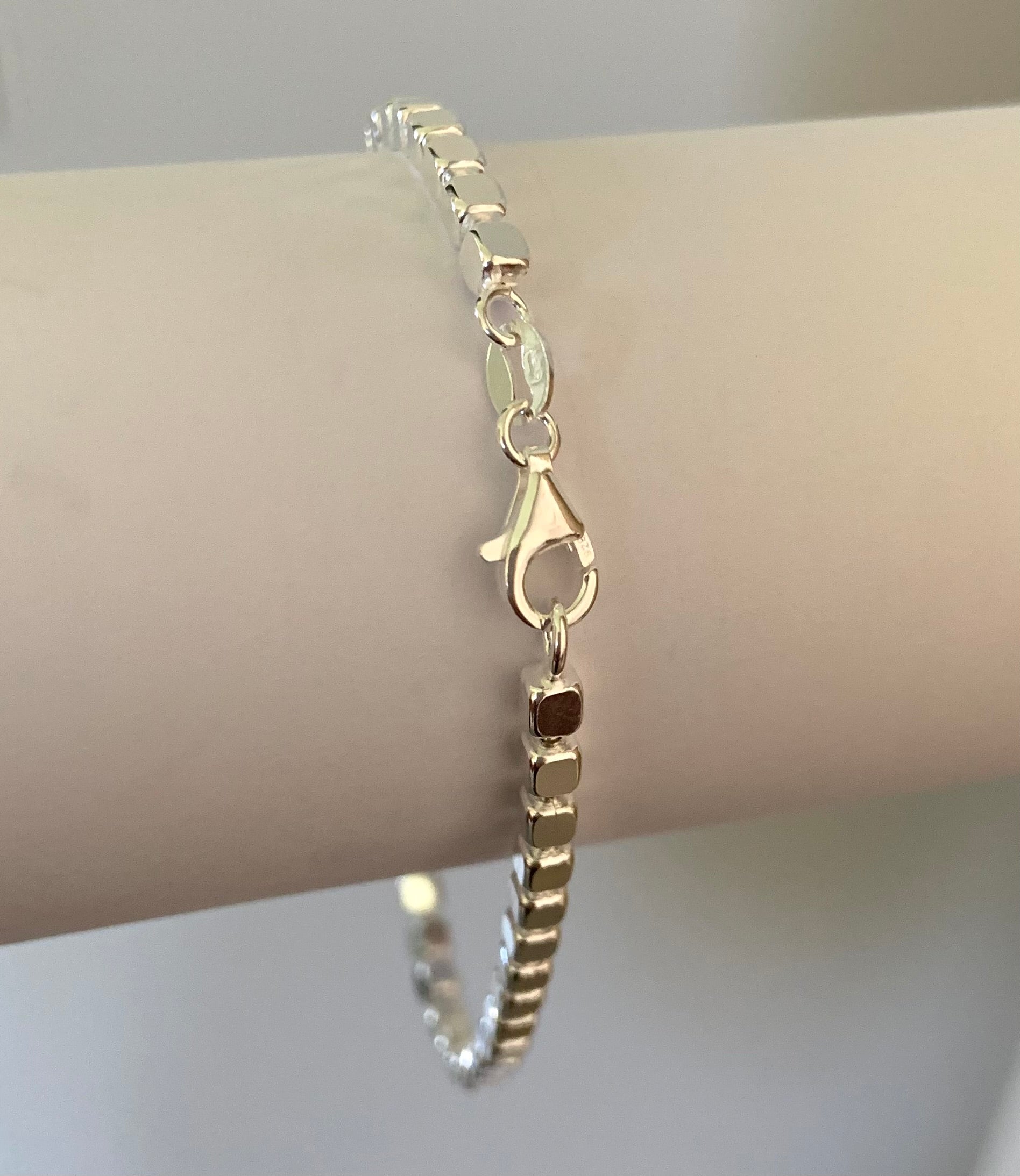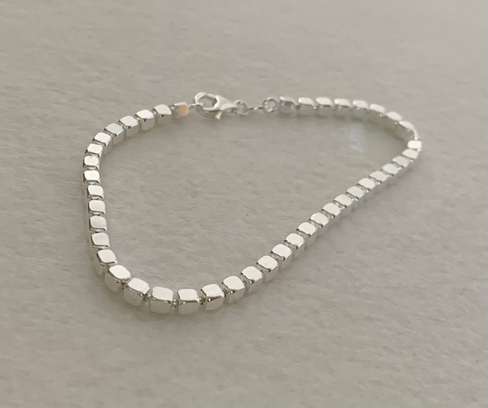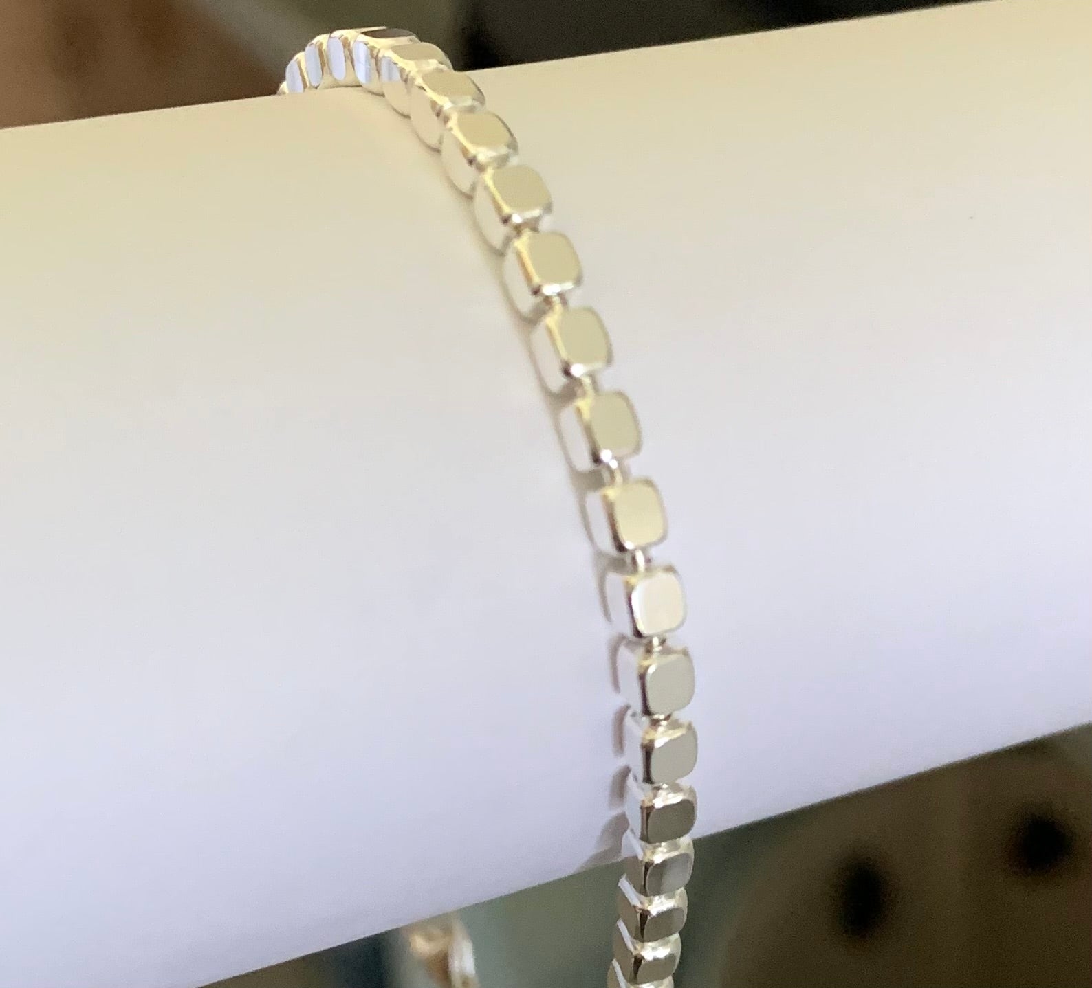 Queen & County premium collection! Stunning, shiny and reflective. So stylish it will catch everyone's eye, it's a real show piece! The cubes are substantial in size at 3mm. Has a nice sturdy lobster clasp. Available in 7 inch length or 7.5 inch. Solid 925 sterling silver from Italy. As a customer favourite and a best seller, this one gets the Queen & County royal recognition!