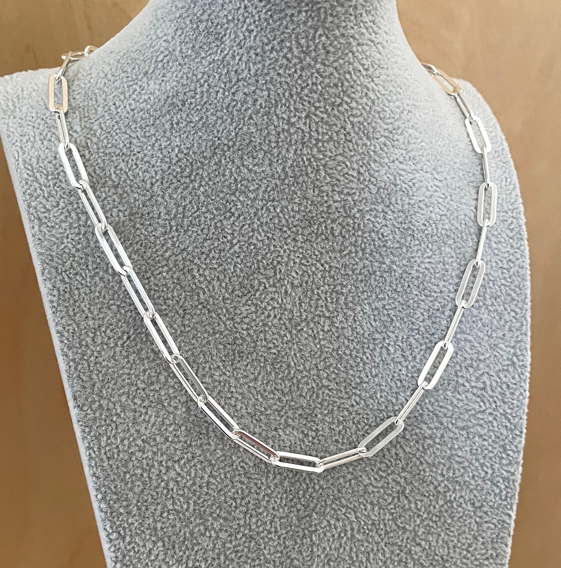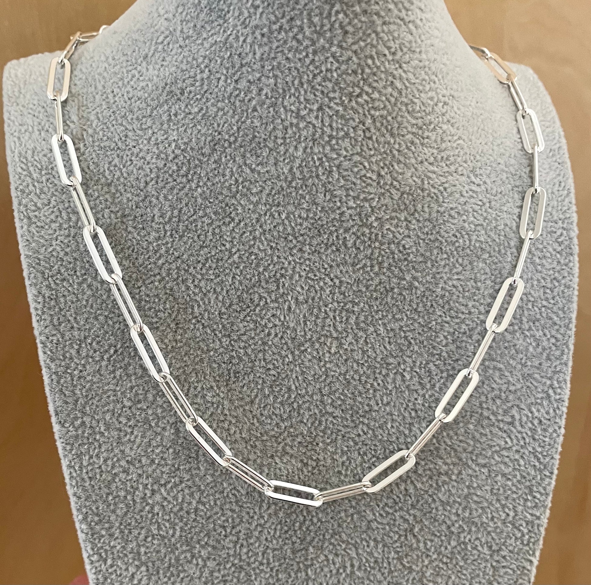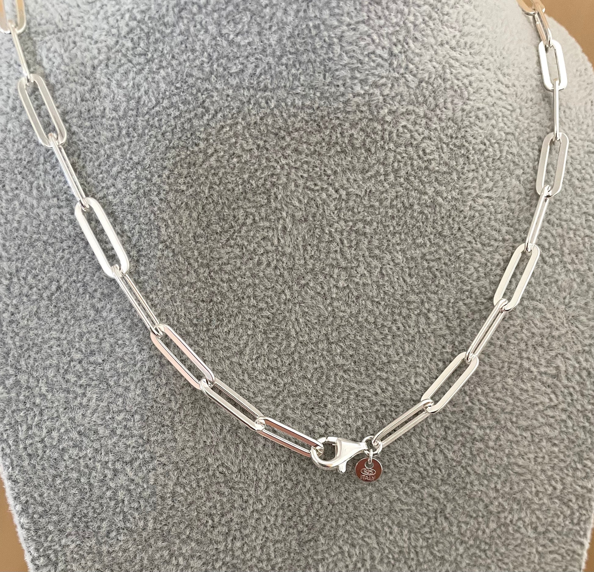 Super shiny and reflective, this premium paperclip necklace will really make a statement! It has super stylish large size flat links at 5mm in width. Length is 18 inches and is very versatile as it's adjustable! Just clasp into the link you prefer to wear as a choker or at any length you desire. Has a nice strong lobster clasp. Solid 925 sterling silver from Italy.